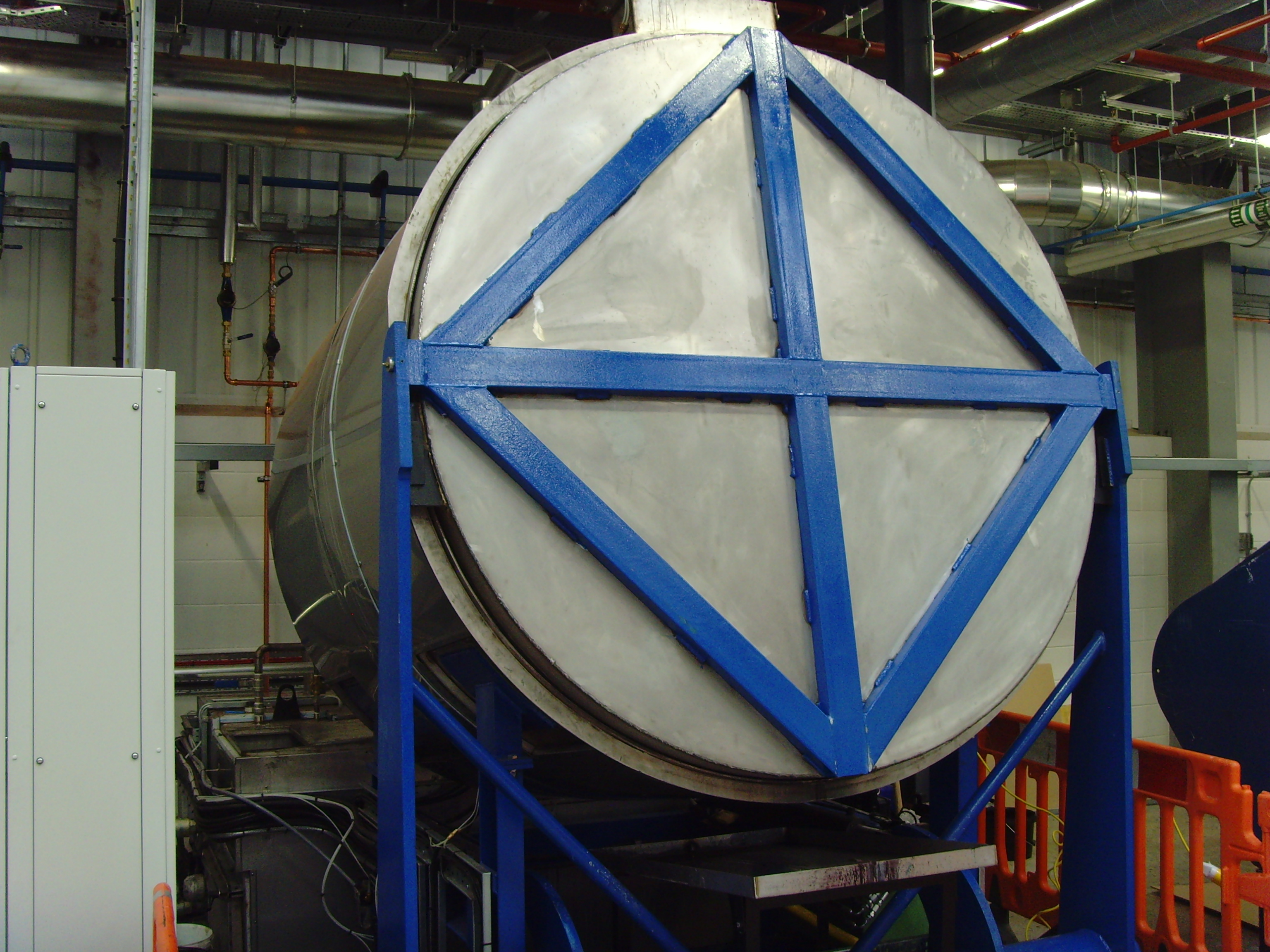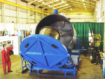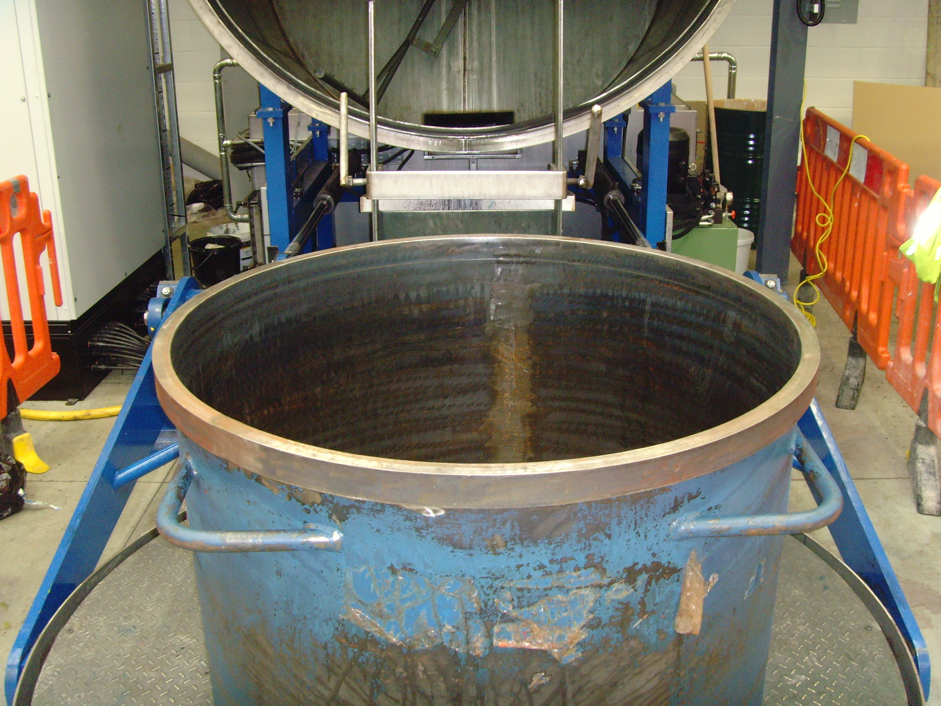 The RotaJet by PRI (Model PW) is designed for cleaning mixing vessels ranging from 61” (1550mm) tall with diameters from 24” (600mm) to 69” (1750mm) and volumes from 100 gallons (378L) to 850 gallons (3218L). The dirty vessels are places onto the lifting lid. Once locked into position, the vessel is loaded into the wash chamber using a hydraulic jack system. The cleaning process is fully automated, and the vessels are washed, rinsed and dried, ready for production. Fumes are vented prior to opening the system, to limit employee exposure.