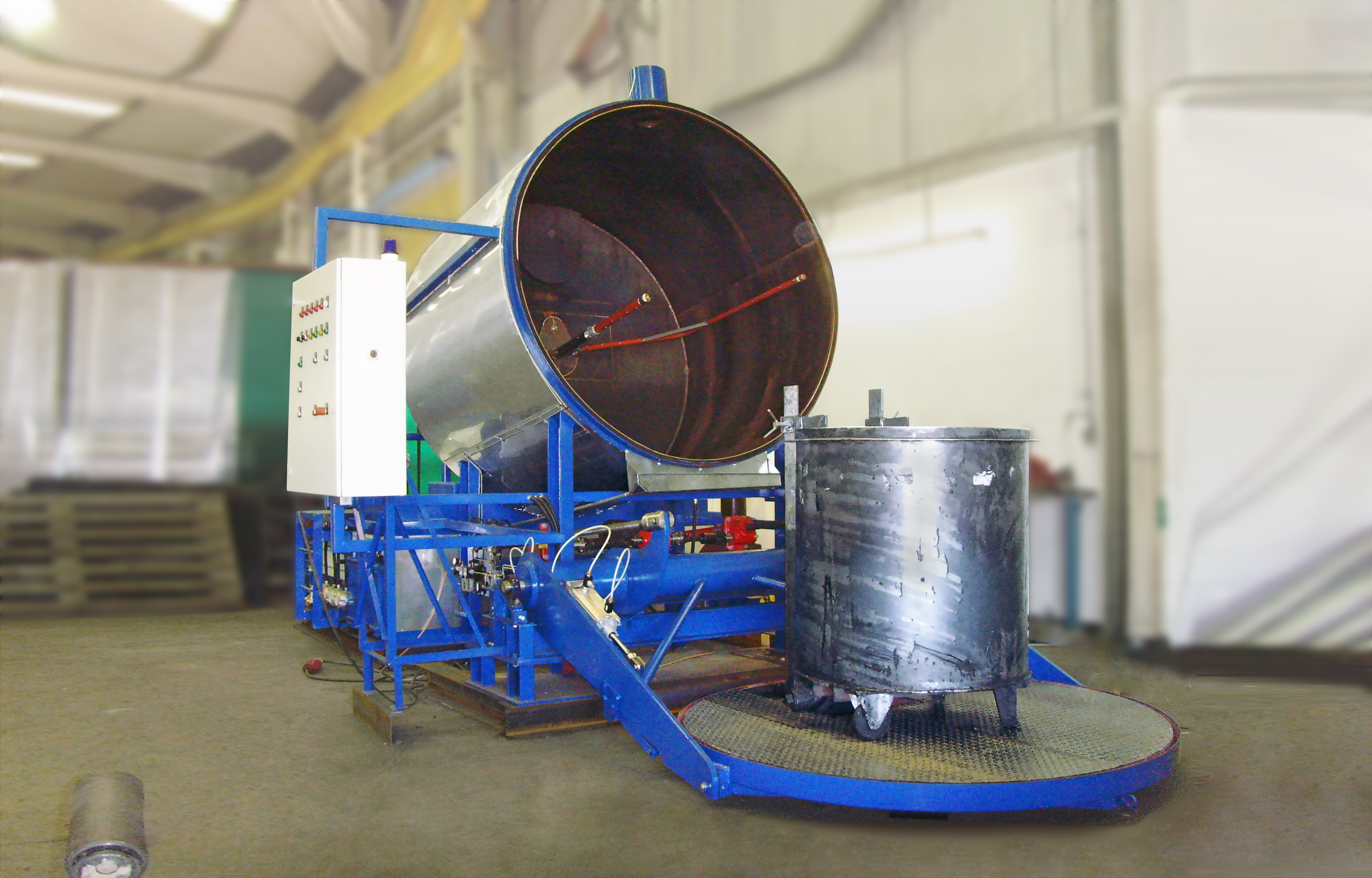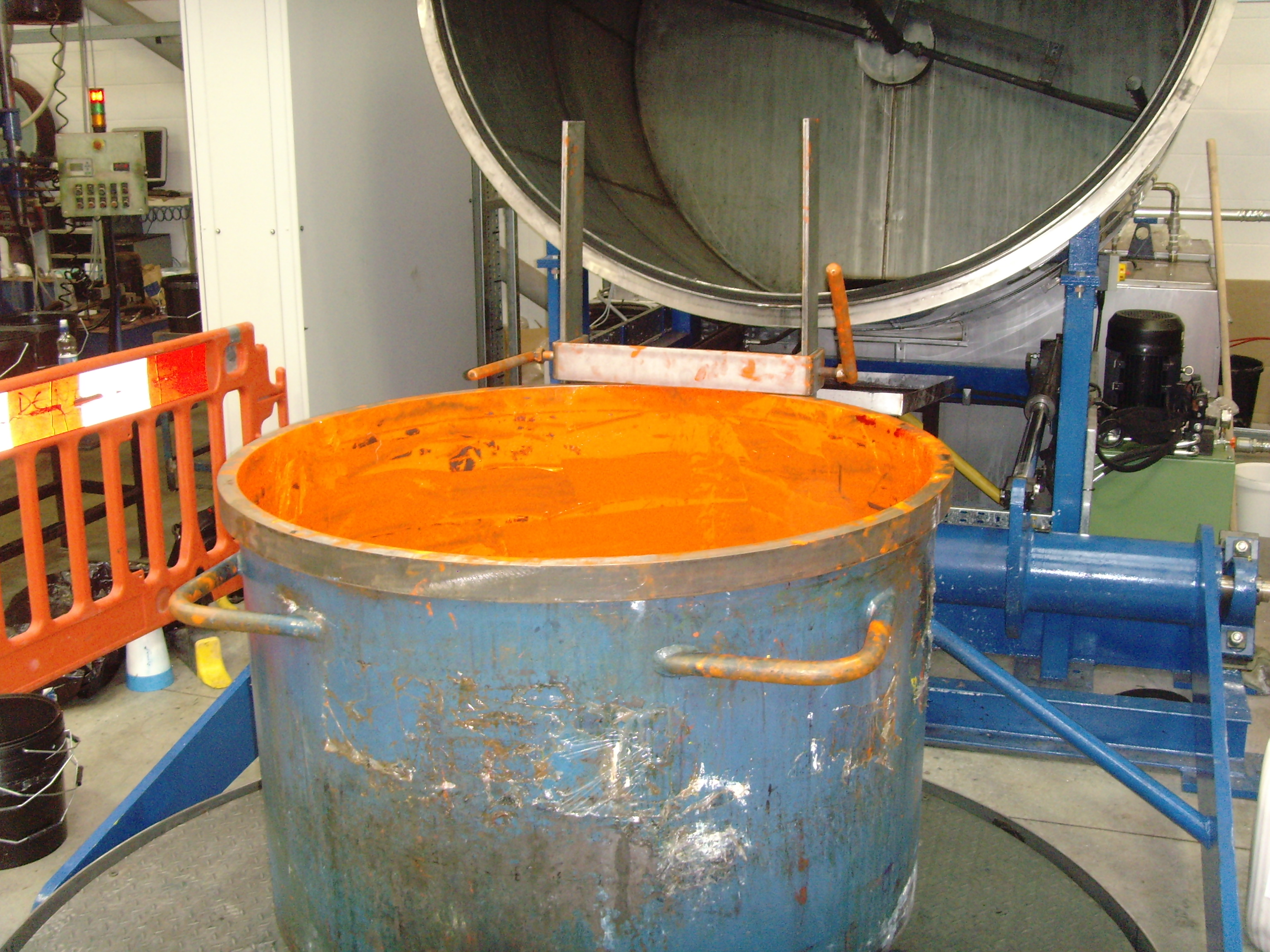 The system typically uses heated alkaline detergent to wash vessels. Once vessels are placed on the platform and locked in place, the vessel is raised into the wash chamber and sealed for the cleaning cycle to start. After caustic washing, the vessels are rinsed with water and flashed dried, ready to be used in production for a new batch of ink or paint.