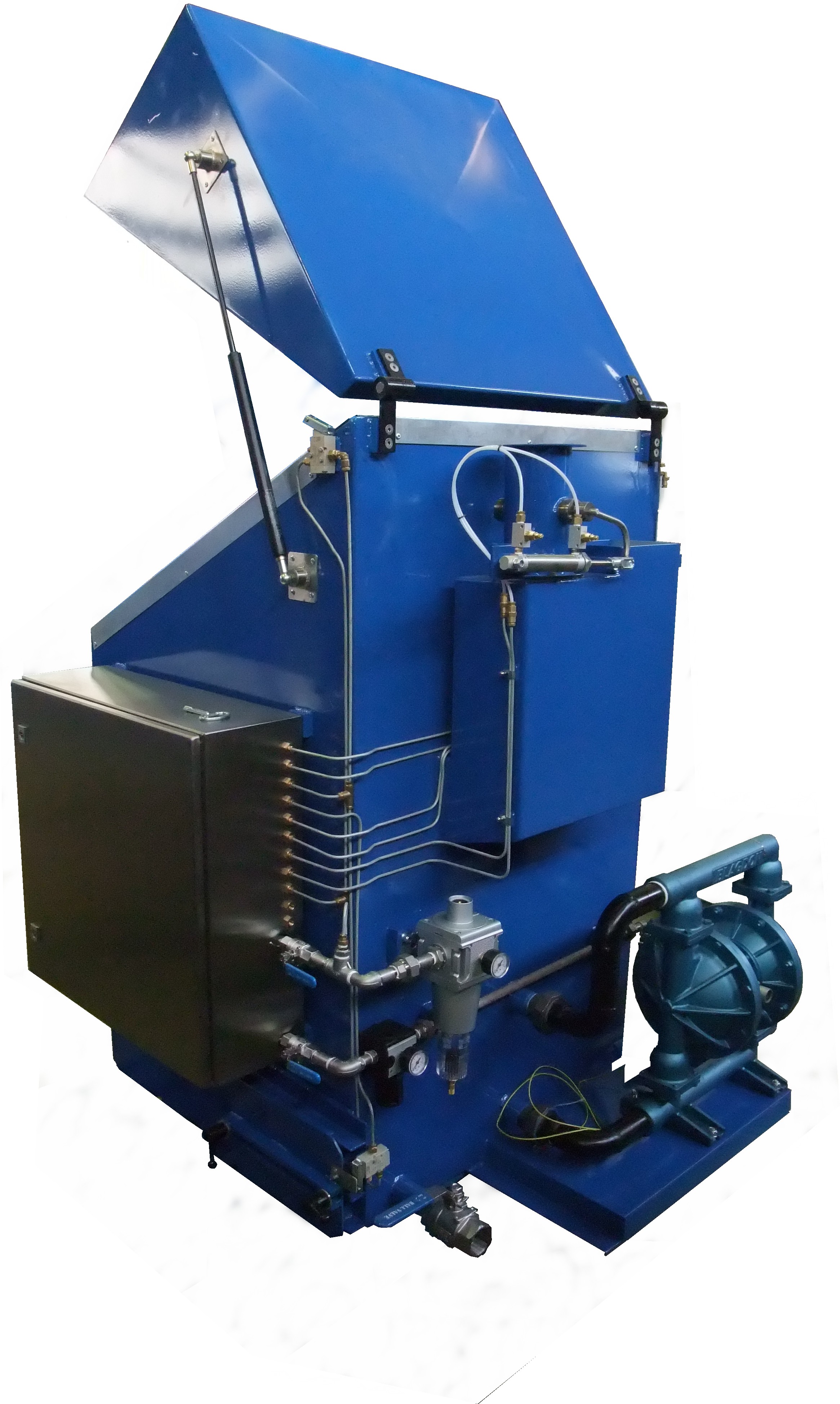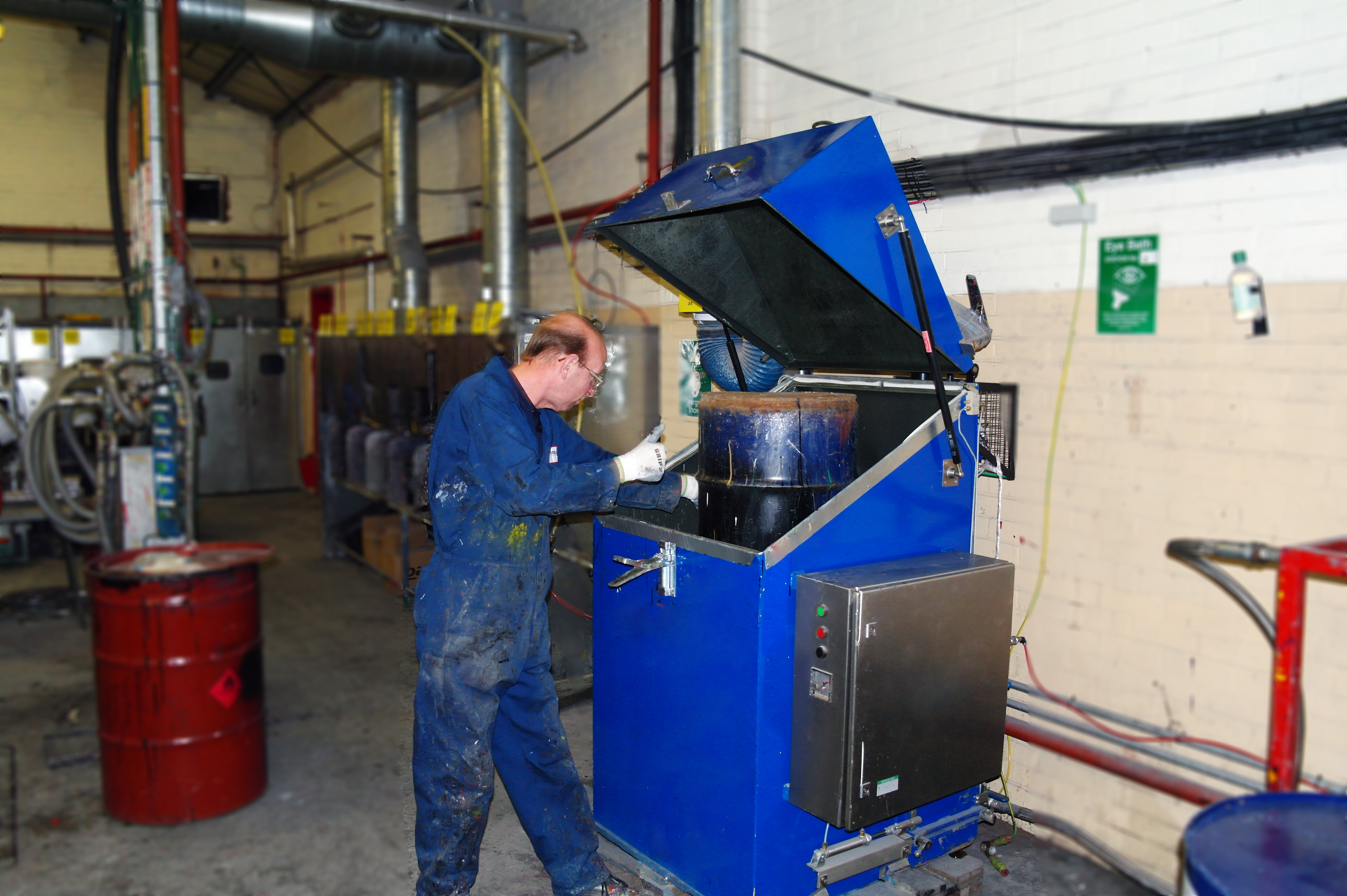 RotaJet by PRI™ (Model TL-DR-55): drum washing machines are designed for low flash point flammable solvent cleaning. Dirty, open-top 55 gallon drums are loaded into the machine, the door is closed and cycle started. The cleaning process is fully automated, and the drums are washed and ready for production. Cycle times are approximately 5 minutes.